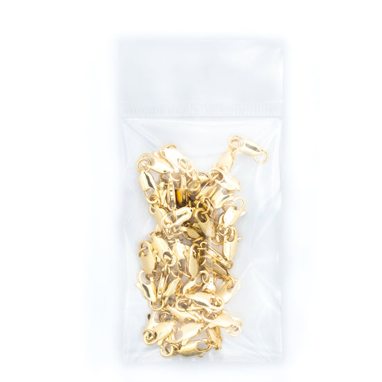 Perfección y estilo con broches langosta de 12 mm. Bolsa con 50 piezas, accesorio esencial para joyería. Fabricados con metal base latón y laminado en oro de 24 quilates, añadiendo lujo y seguridad a tus creaciones únicas.